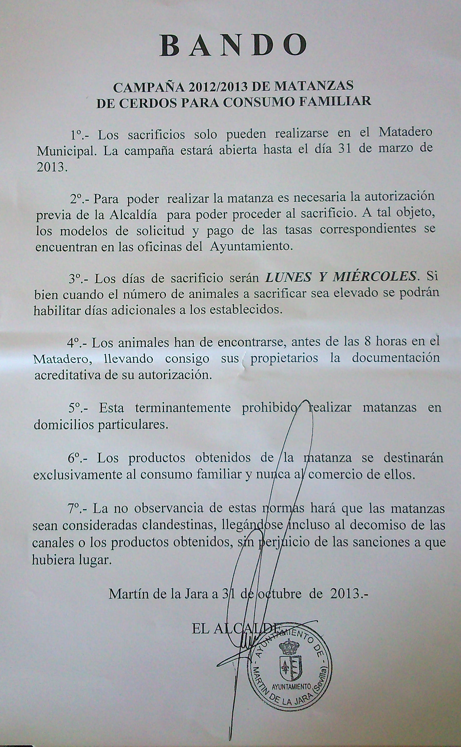 BANDO CAMPAÑA 2012/2013 DE MATANZAS DE CERDOS PARA CONSUMO FAMILIAR