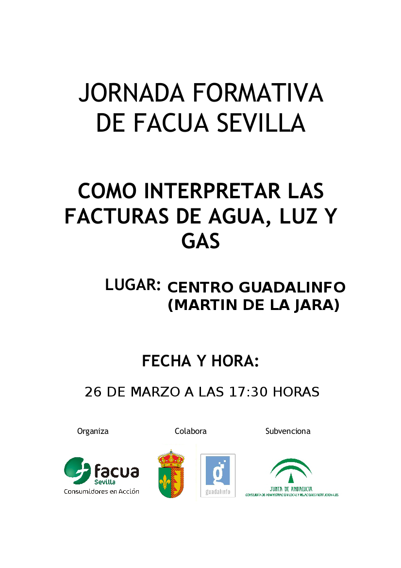 Recordamos que el miércoles 26 de marzo, en el Centro Guadalinfo, a las 17.30 horas, se celebrará la jornada informativa sobre cómo interpretar las facturas del agua, luz y gas.